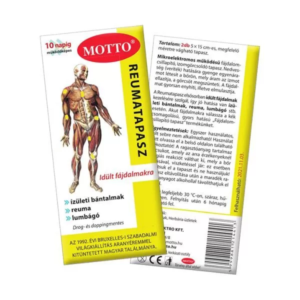 Kar-, váll-, könyök-, térd- és hátfájdalmak enyhítésére szolgáló fájdalomcsillapító tapasz. Méretre vágható, vízálló. 10 napig működőképes. Nem tartalmaz drogokat, doppingmentes. Mikroelektromos működésű fájdalomcsillapító, izomgörcsoldó tapasz.