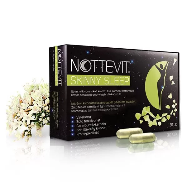 Mert a NOTTEVIT Skinny Sleep® az egyetlen, kettős hatású esti stresszoldó, alvást segítő termék az éjszakai testsúlykontroll szolgálatában: egy hagyományos készítményhez képest nem csak a minőségi alvásban segít, hanem értékes összetevőivel hozzájárul az alvás közbeni fokozott zsírégetéshez és a testsúly csökkentéséhez. A minőségi alvást standardizált valeriana, golgotavirág és komlótoboz kivonatokkal támogatja. Éjszakai testsúlykontrollt támogató összetevői pedig minden éjjel belülről segítik a zsírlebontó anyagcserét.